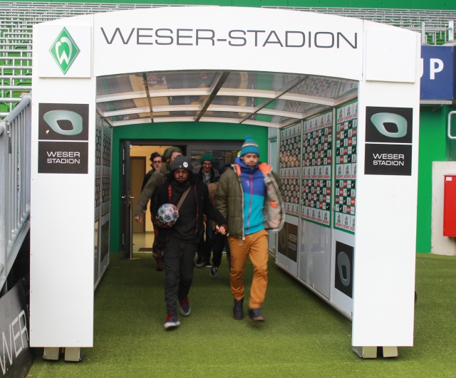 Nach der kurzen Trainingseinheit führte Gesa Mann vom FAN-PROJEKT Bremen die gesamte Gruppe durch das Weserstadion. Gästekabine, Ostkurve, Mixed-Zone und Trainerbank – wie schon in Dortmund ein einmaliger Blick hinter die Kulissen eines Bundesligastadions. Am Abend wurde der Ostkurvensaal zur Bühne für die Protagonisten von SoF e.V. und Arts2Hearts. Andrew, Andi, Joel und Antonio präsentierten das Projekt und ihre persönlichen Erlebnisse aus Afrika. Unter den Gästen war unter anderem Futebol de Salao Bremen, die vom Spaß und der Spielfreude des Futsals in der Halle erzählten – vielleicht bald auch eine Idee für Erfurt.