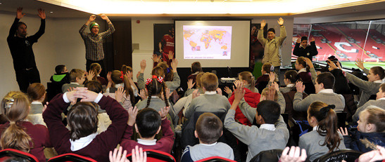 Am Nachmittag begrüßte The Ball zwei Schulklassen aus Liverpool, die mit der Liverpool-Stiftung kooperieren. Die englischen Schülerinnen und Schüler lauschten aufmerksam den Geschichten der vergangenen Ball-Reisen und den Abenteuern der aktuellen Reise nach Brasilien. Am Ende des Vortrages flogen wieder etliche Kopfbälle durch den Raum und Unterschriften verewigten sich auf der runden Kugel.