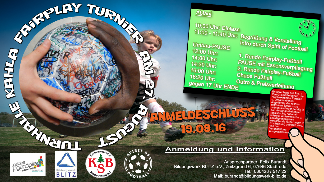 Am Samstag, den 27. August 2016 rollt „Am Sportplatz“ wird in Kahla ein fairer Ball über den Rasen gespielt. In Kooperation mit dem Bildungswerk Blitz e.V., der Gebietsjugendpflege südliches Saaletal und dem Kreissportbund Saale-Holzlandein FairPlay-Turnier, bei dem das gemeinsame Spaß haben und das „get to know someone“ im Mittelpunkt stehen.