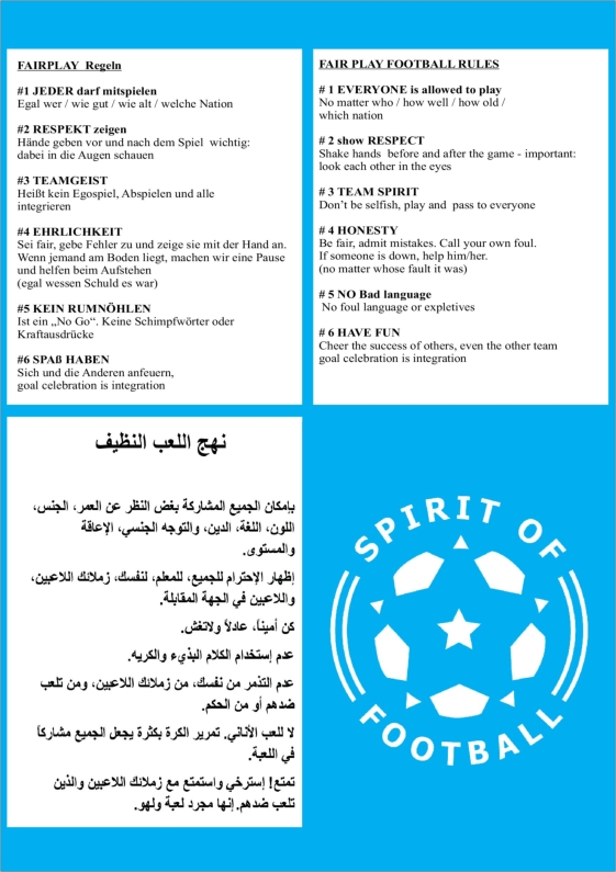Sechs FairPlay-Regeln auf englisch, deutsch, arabisch