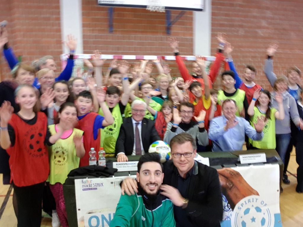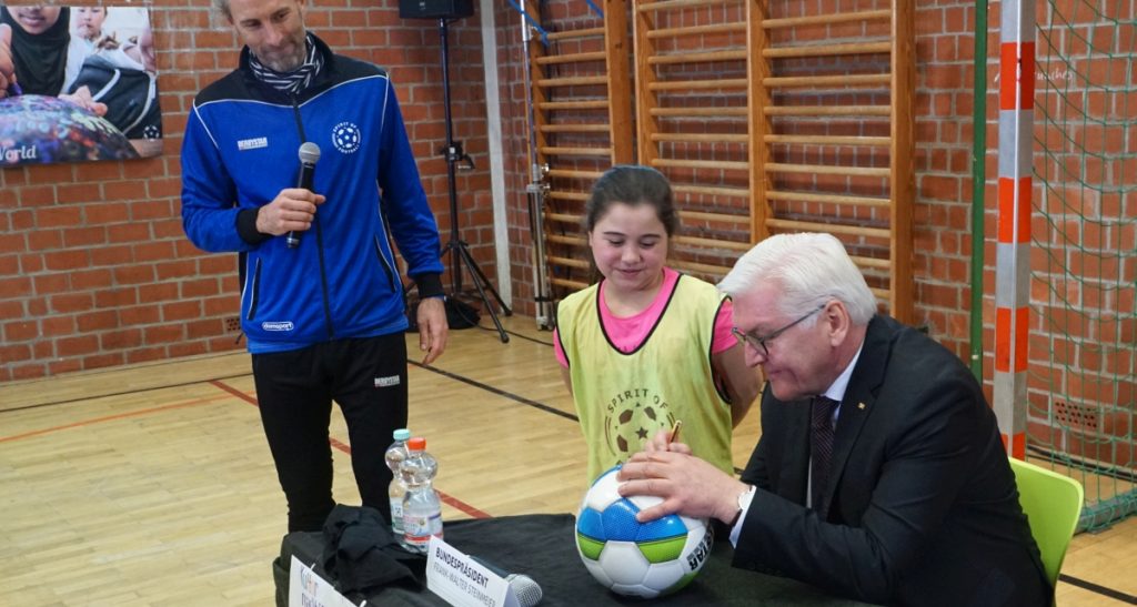 Die 24 Kinder standen im Spalier, als sich die Turnhallen-Tür um Punkt 15:55 öffnete und der Bundespräsident unter großem Jubel, High-Fives und der Champions-League-Hymne die Turnhalle betrat. Gemeinsam mit seiner Frau Elke Büdenbender, Thüringens Ministerpräsident Bodo Ramelow, seiner Gattin Germana Alberti vom Hofe und Spirit of Football’s Schirmherr Carsten Schneider nahm das Staatsoberhaupt an einem anderthalbstündigen Programm teil.