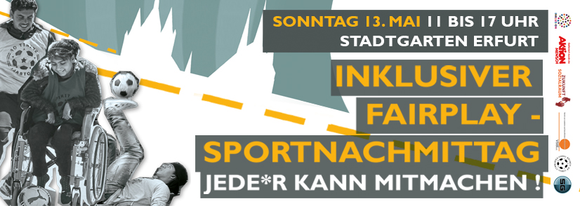 Unter dem Motto „Inklusion von Anfang an“ soll ein generationsübergreifender sportlicher Aktionstag für Kinder und Jugendliche mit und ohne Behinderung aus Erfurt und Umgebung am 13.05.18 ab 11 Uhr im Stadtgarten Erfurt stattfinden. Veranstaltet wird ein Familienfest mit Sportcharakter, bei dem die bekannten Fußballregeln so ausgelegt werden, dass eine positive und lustige Atmosphäre entsteht, bei der die Entwicklung des Gemeinschaftssinns und eines gemeinsamen Teamgeistes im Vordergrund steht. Jeder darf mitspielen – egal wie gut, wie alt, welche Nation, mit oder ohne Teilhabeeinschränkung.