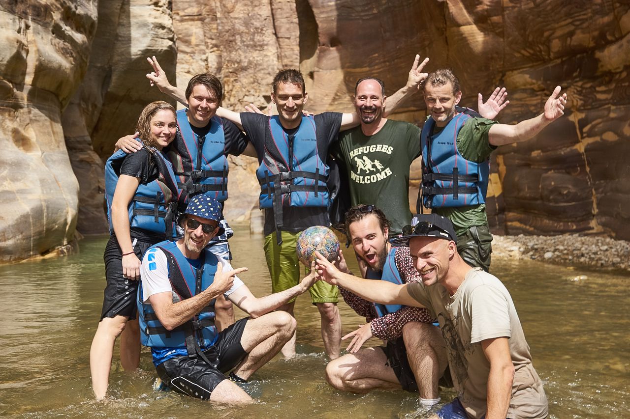 Im Bus geht es zurück nach Amman, wo wir für eine Woche Auszeit packen. Die Zusammensetzung der Gruppe ist dabei etwas ganz Besonderes. Mit Chris, Phil und Richard, den Gründervätern von Spirit of Football und uns (Andrew, Stützi, Benni G, Nicola, und Robert) sind zum ersten Mal mehrere Generationen von Spirits zusammen unterwegs.
