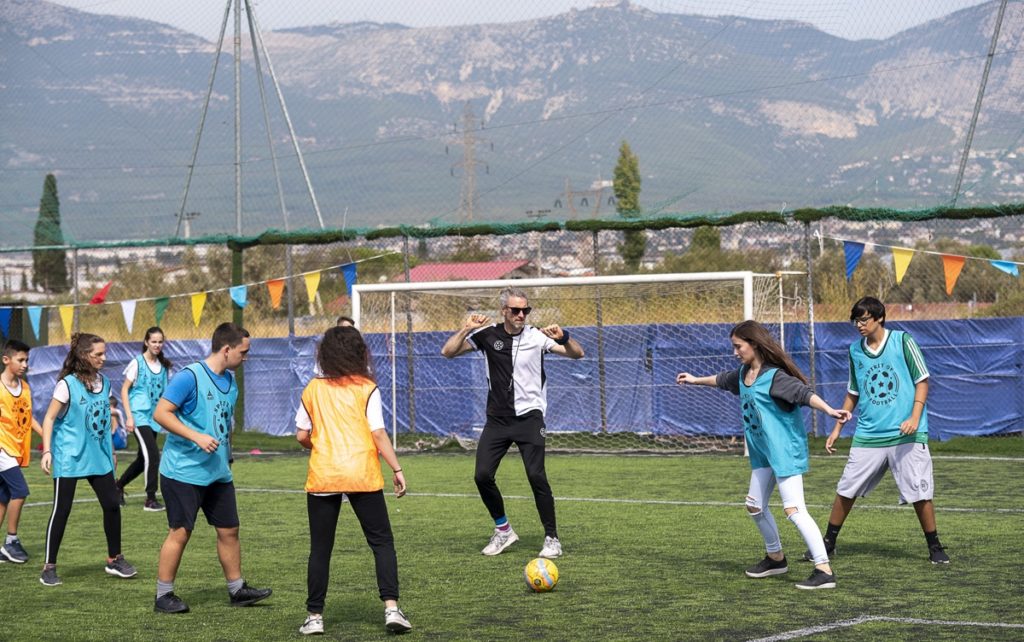 Der Ball ist zurück im Spiel und bringt Menschen in Begegnung. Andrew Aris (Bildmitte) und sein Spirit of Football Team sind – wie hier 2019 in Athen – wieder für internationale Projekte im Ausland unterwegs. Foto: Vangelis Patsialos