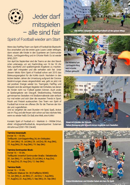 Seit nunmehr 2015 rollt der Spirit-Ball kontinuierlich durch die Erfurter KoWo-Quartiere. Mit einem fairrückten Spirit-Team geht’s ab den 17.04 wöchentlich jeweils zum Wohnkomplex des Dortmunder Blockes sowie zum Juri-Gagarin-Ring. Die Termine finden sich wie gewohnt am Schaukasten der Wohnquartiere oder im Kalender auf unserer Homepage. Sulaiman und sein Team freuen sich, wenn Ihr vorbeischaut.