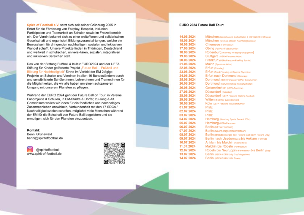 Spirit of Football e.V. setzt sich für Weltoffenheit und gegen Ausgrenzung jeglicher Art ein. Kern unserer non-formalen Bildungsarbeit sind die Reisen von „The Ball“ zu den Fußball-Weltmeisterschaften. Mit der Weltsprache Fußball und seiner interkulturellen Kraft wurden seit 2002 über 40.000 Menschen erreicht. Diese Erfahrungen fließen in die Curricula der schulischen und außerschulischen Bildungsangebote, die wir seit 2010 umsetzen.