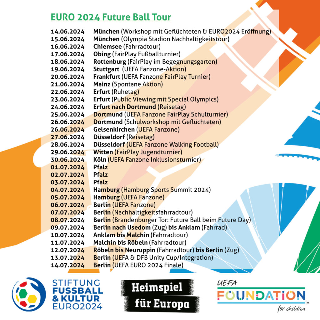 Am 14. Juni ist es endlich so weit. Die EURO24 startet und damit auch die Future Ball Tour! Kick-off ist in München, wo auch das Eröffnungspiel in Deutschland gegen Schottland stattfindet. Seht hier die Tourstopps der Future Ball Tour. Kommt vorbei und setzt euch zusammen mit uns für eine nachhaltige Zukunft ein!