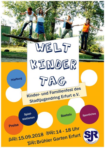 die Mitglieder des Stadtjugendring Erfurt e.V. veranstalten am Samstag, den 15. September 2018 von 14 Uhr bis 18 Uhr anlässlich des Weltkindertages, zum zwölften Mal, den Kinder- und Jugendtag mit dem traditionellen Familien- und Spielfest im Brühler Garten, zu dem wir Sie recht herzlich einladen möchten. Wir haben vielfältige Spiel- und Aktionsstationen vorbereitet, an denen sich unsere Gäste, ob groß oder klein, ob alt oder jung, gemeinsam sportlich betätigen können, ihre Geschicklichkeit ausprobieren oder selbst kreativ werden.